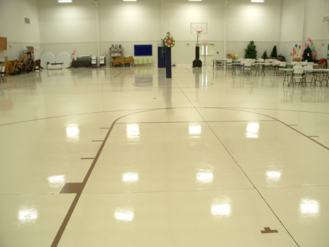 This gym was a challenge.. It has a volley ball court at one end. We laid out the court so they could put sleeves into the concrete for the poles for the net.